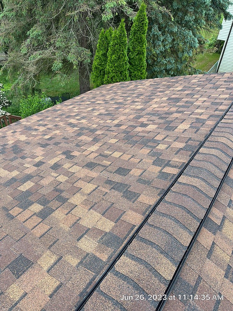 We removed a chimney from this valley and installed new CerTainteed Northgate Burnt Sienna Hail resistant shingles, As well as Air Vent high flow ridge vents. Soffit vent are CerTainteed parameter high flow to match.